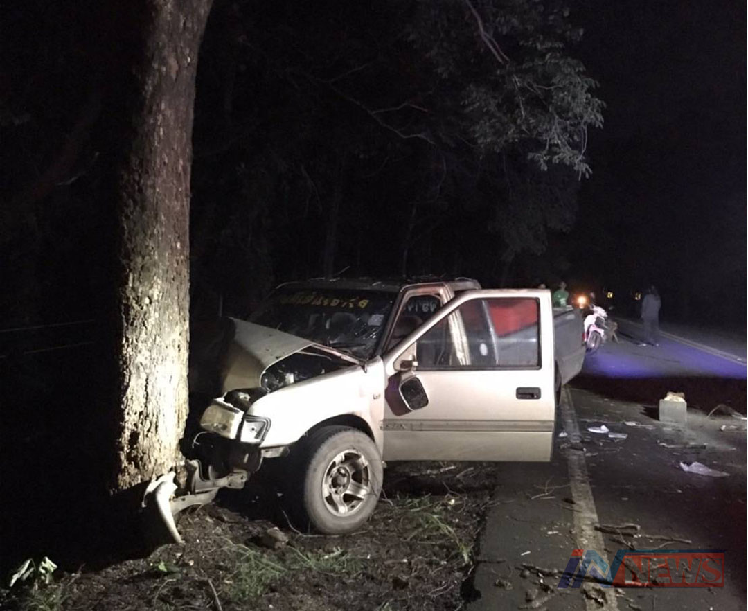 สาวใหญ่ค้าปลาศรีสวัสดิ์ซิ่งกระบะทำเวลา เคราะห์ร้ายเสียหลักชนต้นไม้ดับคารถ