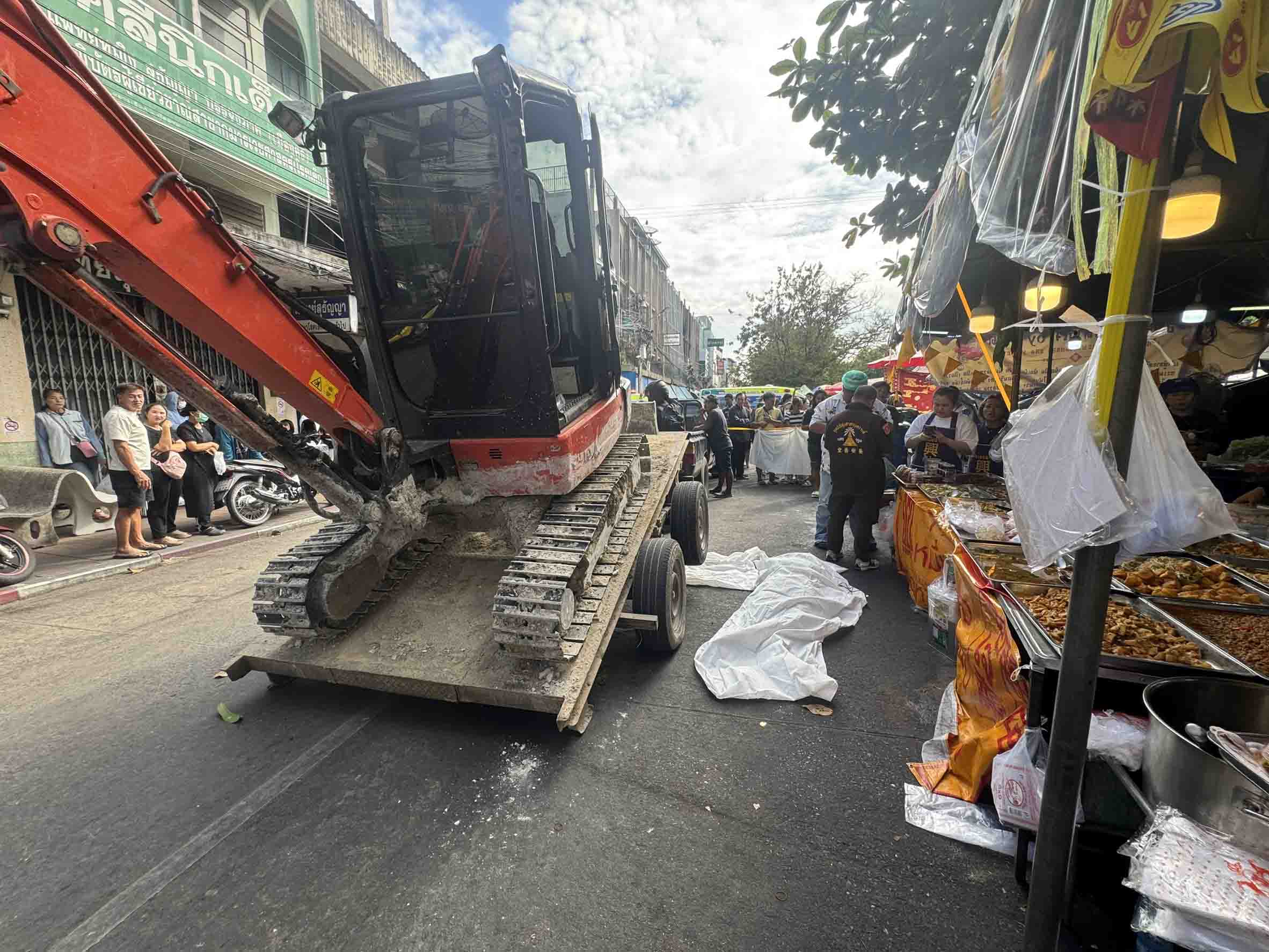 หญิงนครปฐมดวงดับถูกรถพ่วงขนแบ๊คโฮ เกี่ยวแล้วทับร่างช่วงซื้ออาหารเจดับ