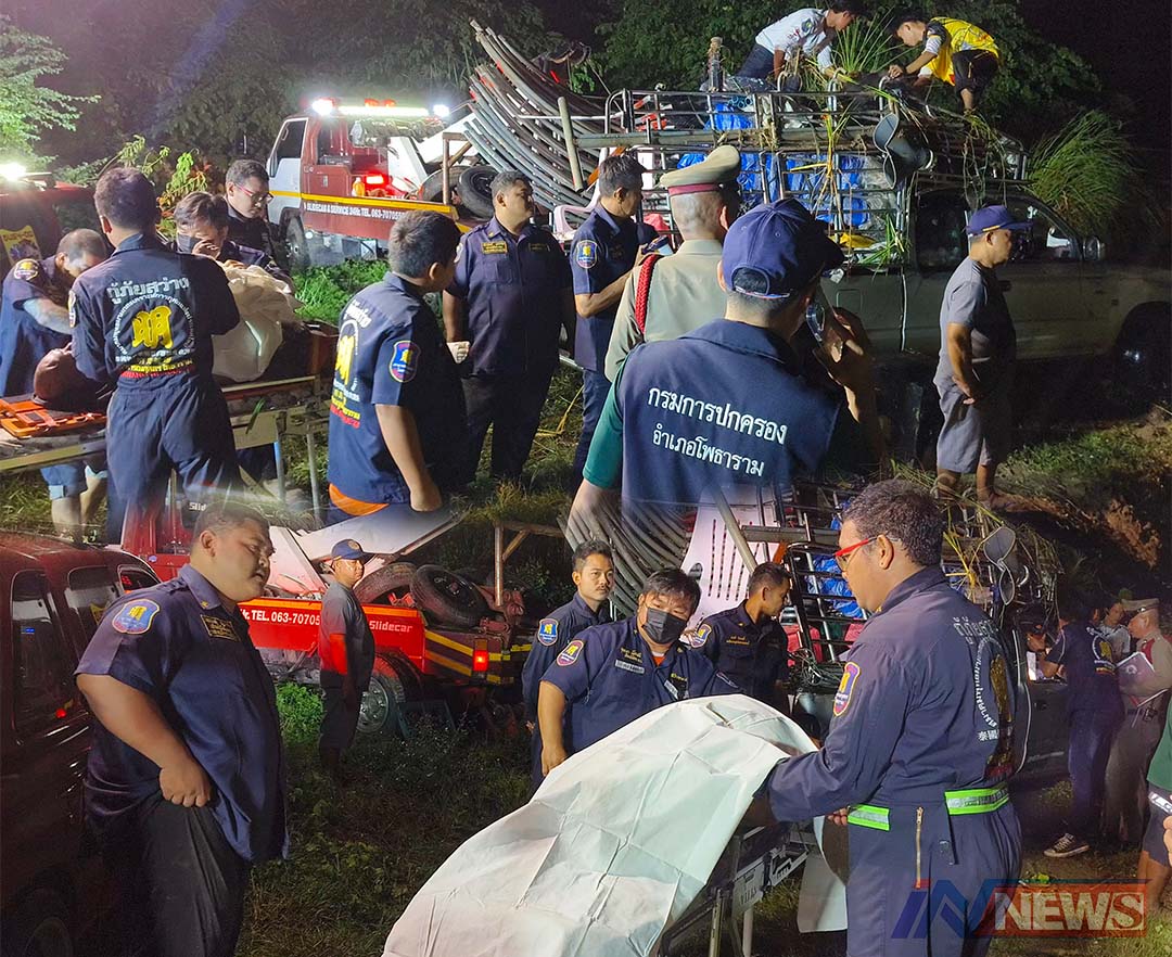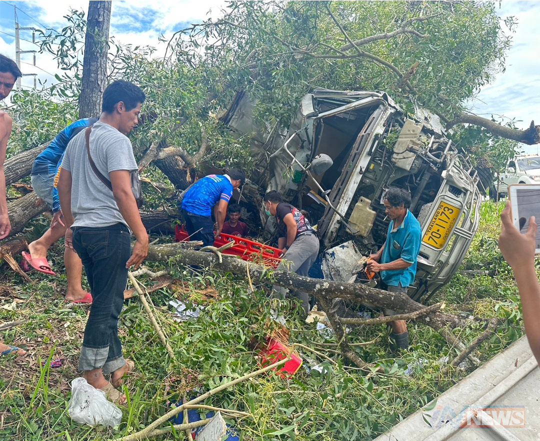 ลุงวัย70ปีขับรถขนสินค้าเสียหลักชนต้นไม้ ร่องกลางถนนรถพังยับคนขับดับคารถ