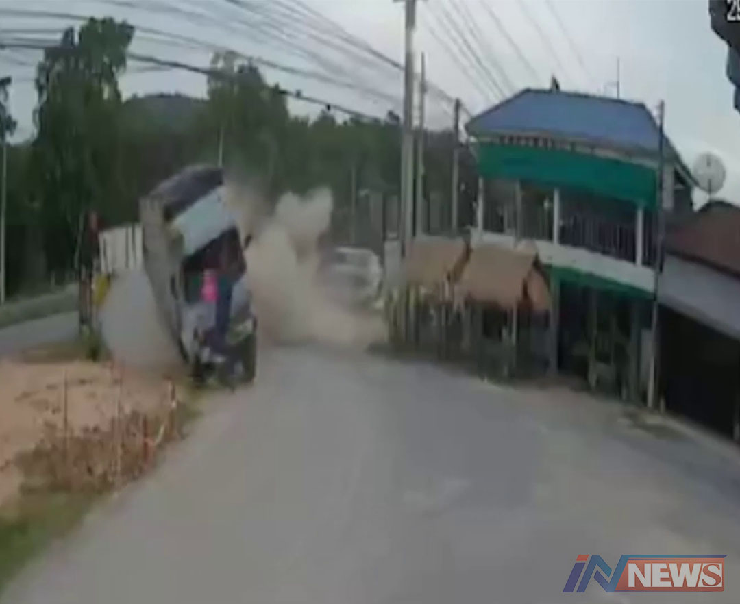 วงจรปิดจับภาพวินาทีที่รถสิบล้อขนมังคุด ยางแตกพุ่งแหกโค้งหวิดชนคนข้ามถนน