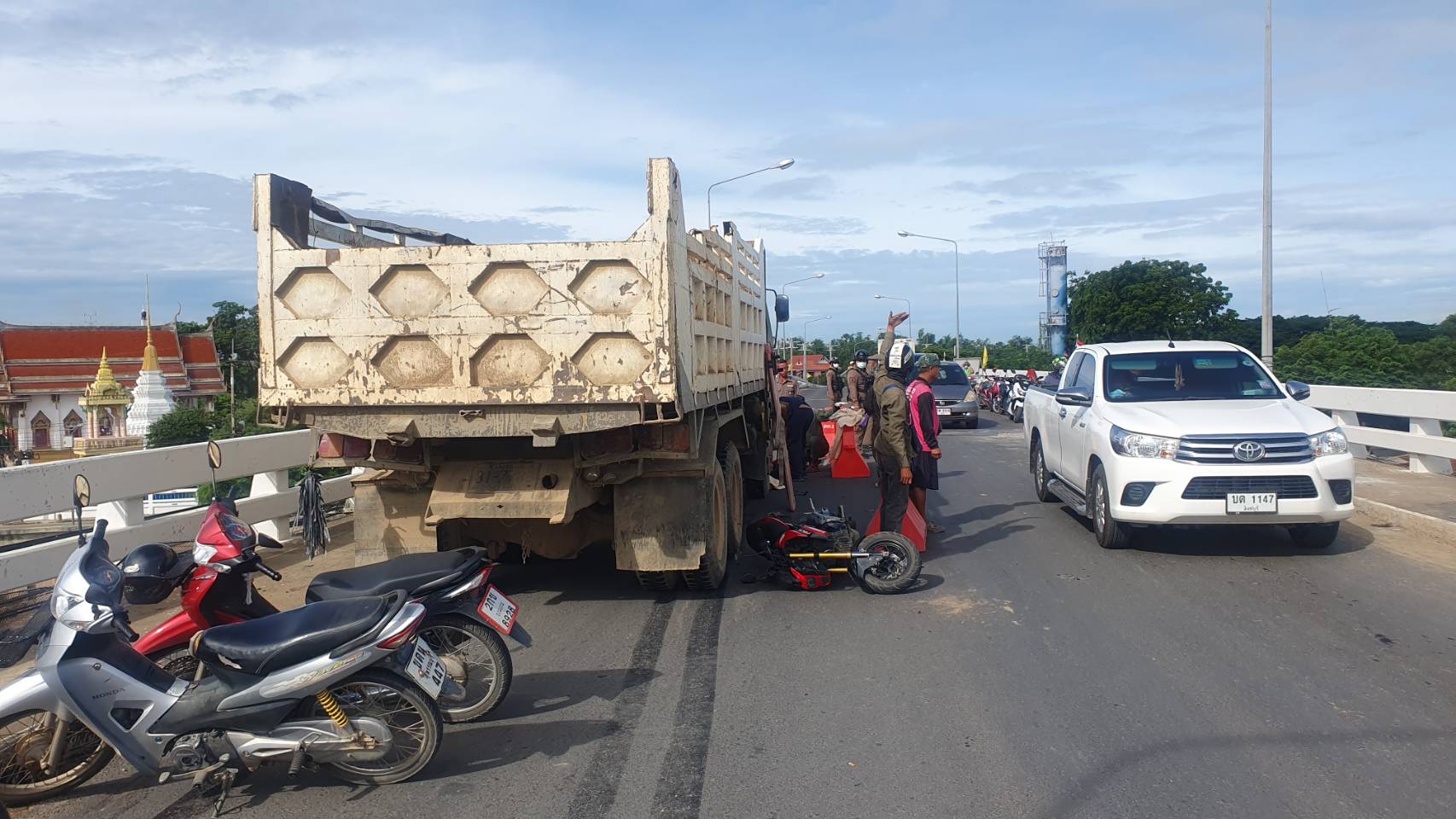 สิงห์บุ-สาววัยเบญจเพสชะตาขาด ขับรถจะไปทำงาน เสียหลักชนท้ายกระบะล้มลงถูกสิบล้อทับดับ