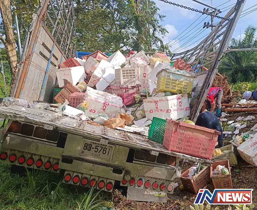 พังงา-สิบล้อบรรทุกผักผลไม้สดเต็มคันส่งห้างดังภูเก็ต ลื่นเสียหลักชนต้นไม้ในร่องเกาะกลางถนนเทกระจาด
