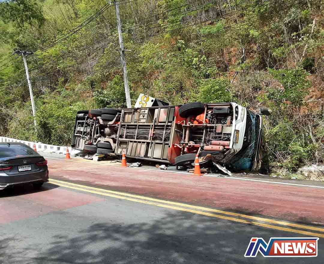 กาญจนบุรี-หวิดตายหมู่ !! รถบัส VIP ขนสมาชิกสมาคมกำนัน-ผู้ใหญ่บ้าน อสม.จ.อ่างทอง มาประชุมสัมมนาที่กาญจน์ ขากลับลงเขา คนขั...