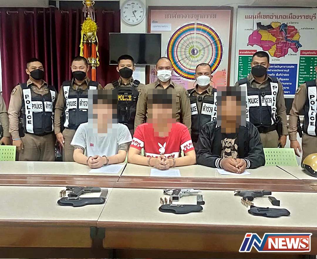 ราชบุรี-รวบ 3 โจ๋ พกปืน 3 กระบอก เคลียร์ปัญหาคู่อริ ที่บริเวณลานจอดรถหน้าร้านนั่งดื่มแห่งหนึ่งในตัวเมืองราชบุรี