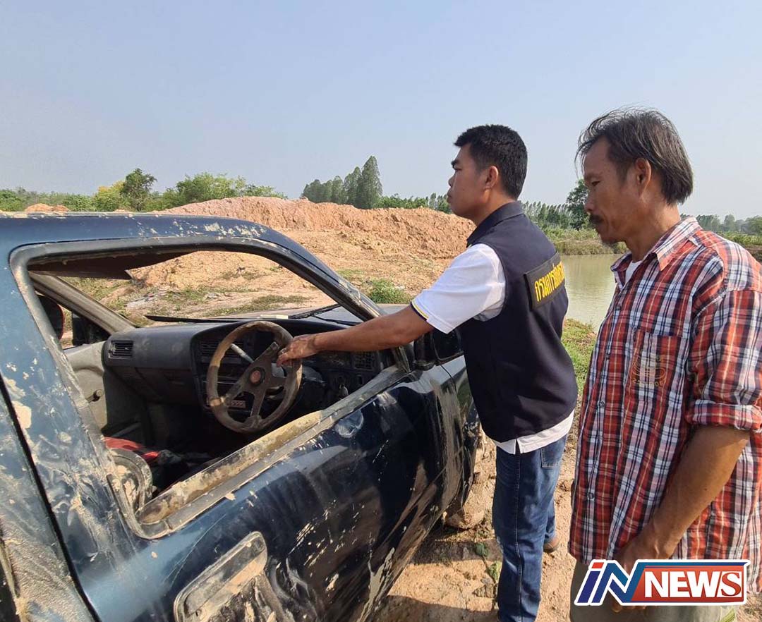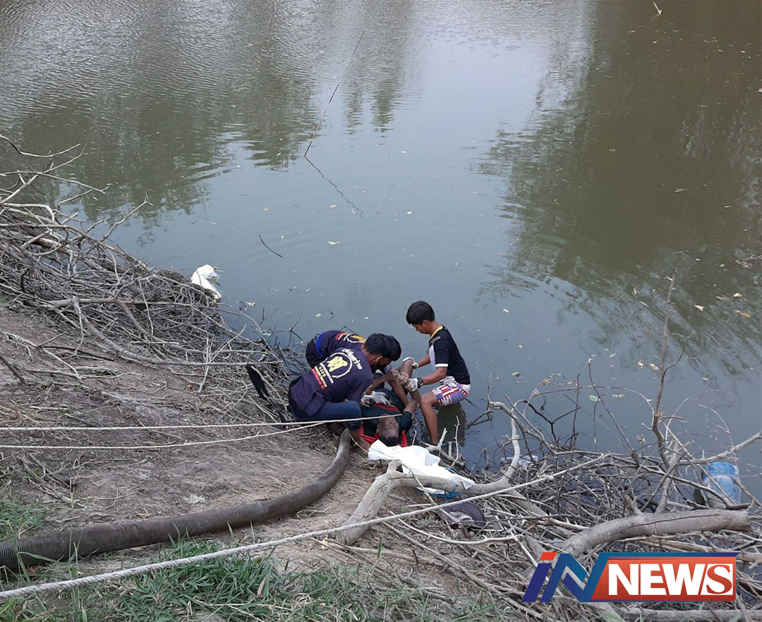 กาญจนบุรี-หนุ่มใหญ่เจ้าของไร่แตงโม ขับรถกระบะมาเปิดเครื่องสูบน้ำเข้าไร่ ขับรถถอยหลัง เกิดพลาดรถตกสระน้ำรถทับแขนออกไม่ได้...