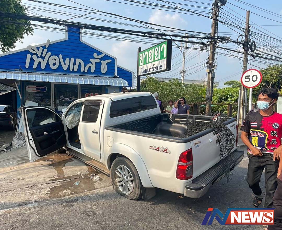 กระบะเสียหลักชนร้านขายยาเจ็บ5ราย สายนครนายก-รังสิต/คนขับจำอะไรไม่ได้