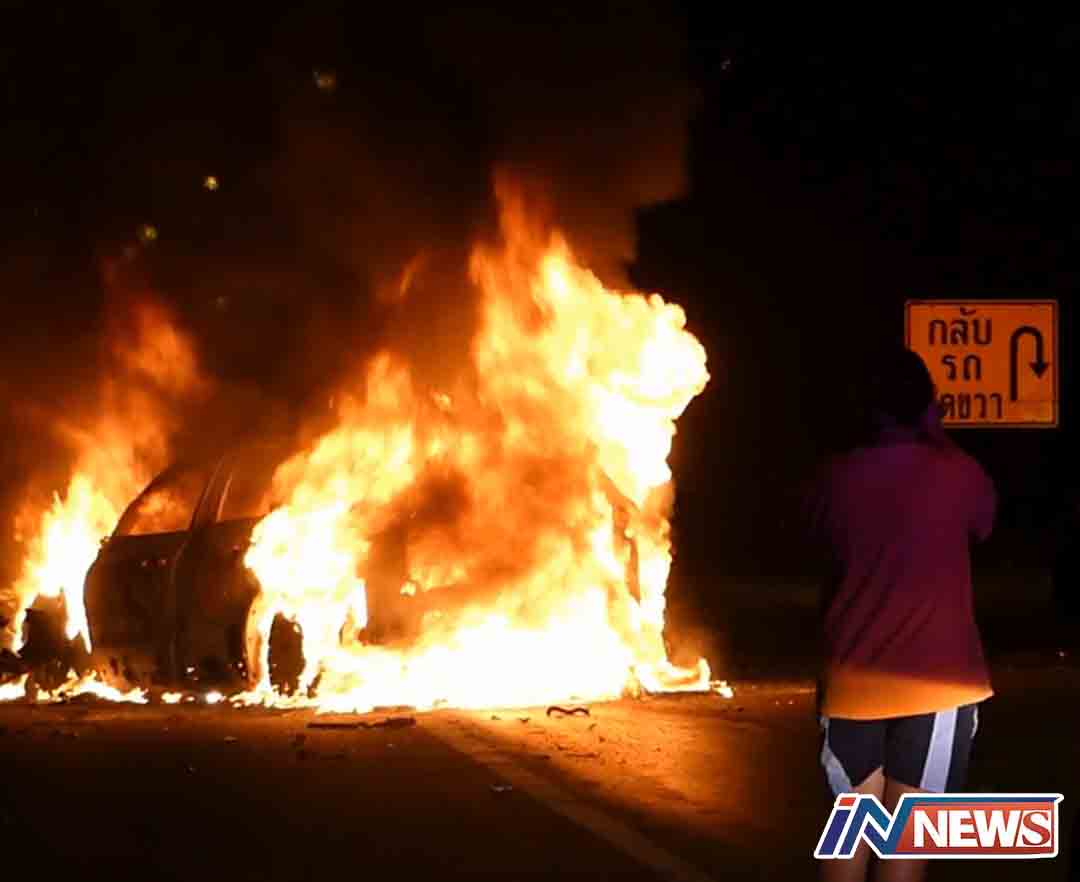 ระทึกเพลิงไหม้รถเก๋งท่วมคันคนขับเกือบหวิดดับ