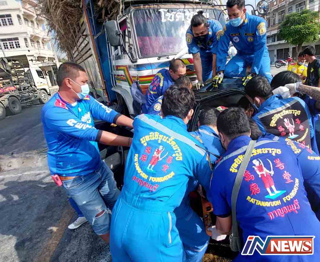กาญจนบุรี-ตูมเดียวรถกลายเป็นเศษเหล็ก ! หนุ่มใหญ่ช่างซ่อมเครื่องเสียงรถยนต์ ขับเก๋งชนประสานงานกับรถ 10 ล้ออ้อยที่กาญจน์ ร...