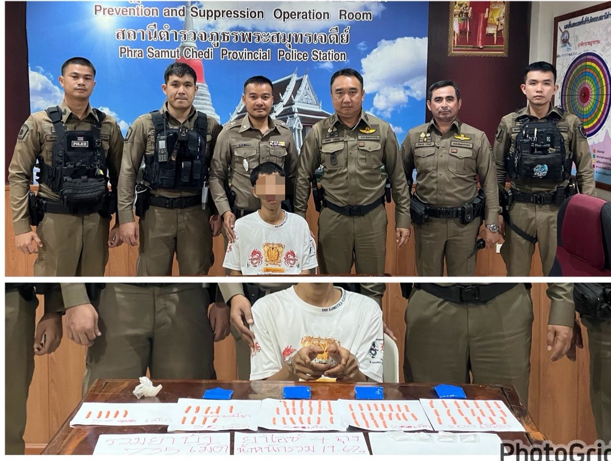 สมุทรปราการ-ตำรวจพระสมุทรเจดีย์ตั้งจุดตรวจป้องกันอาชญากรรมรวบหนุ่มพนักงานร้านค้าของเก่าค้ายาบ้า