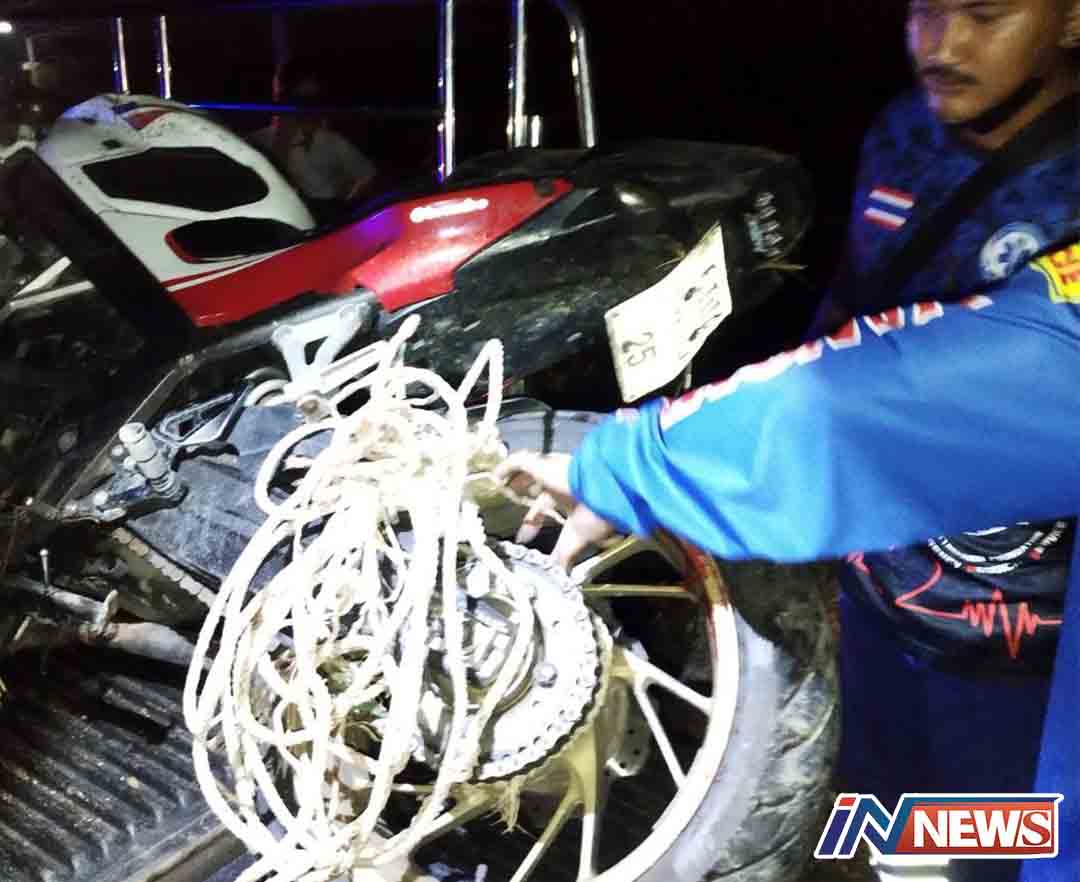 กาญจนบุรี-หนุ่มสนามแย้ กาญจน์ โชคร้าย ควบฮอนด้า CB.650 ซีซี.กลับบ้าน คาดชาวบ้านทำเชือกล่ามวัวตกกลางถนน เชือกพันล้อหลังรถ...