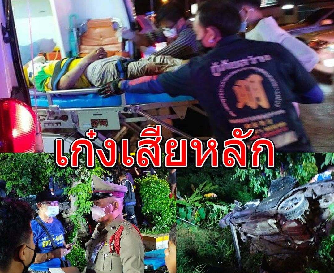2หนุ่มชาวลาวขับเก๋งเสียหลักตกข้างทางชนป้ายแท่งปูนอัดติดภายใน