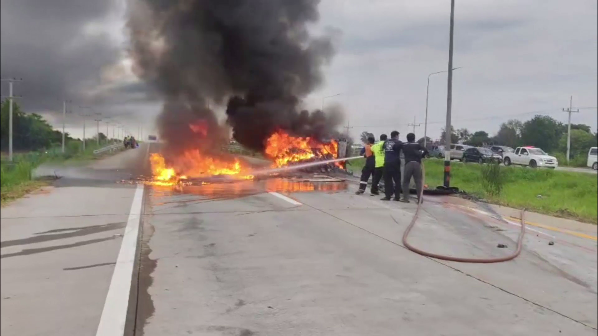 นครราชสีมา-เกิดอีกรอบรถกระบะคอกขนถังสีเกิดยางแตกเสียหลักพุ่งลงข้างทางมอเตอร์เวย์ M6 จนเพลิงไหม้โหมกระหน่ำโชคดีคนขับหนีตา...