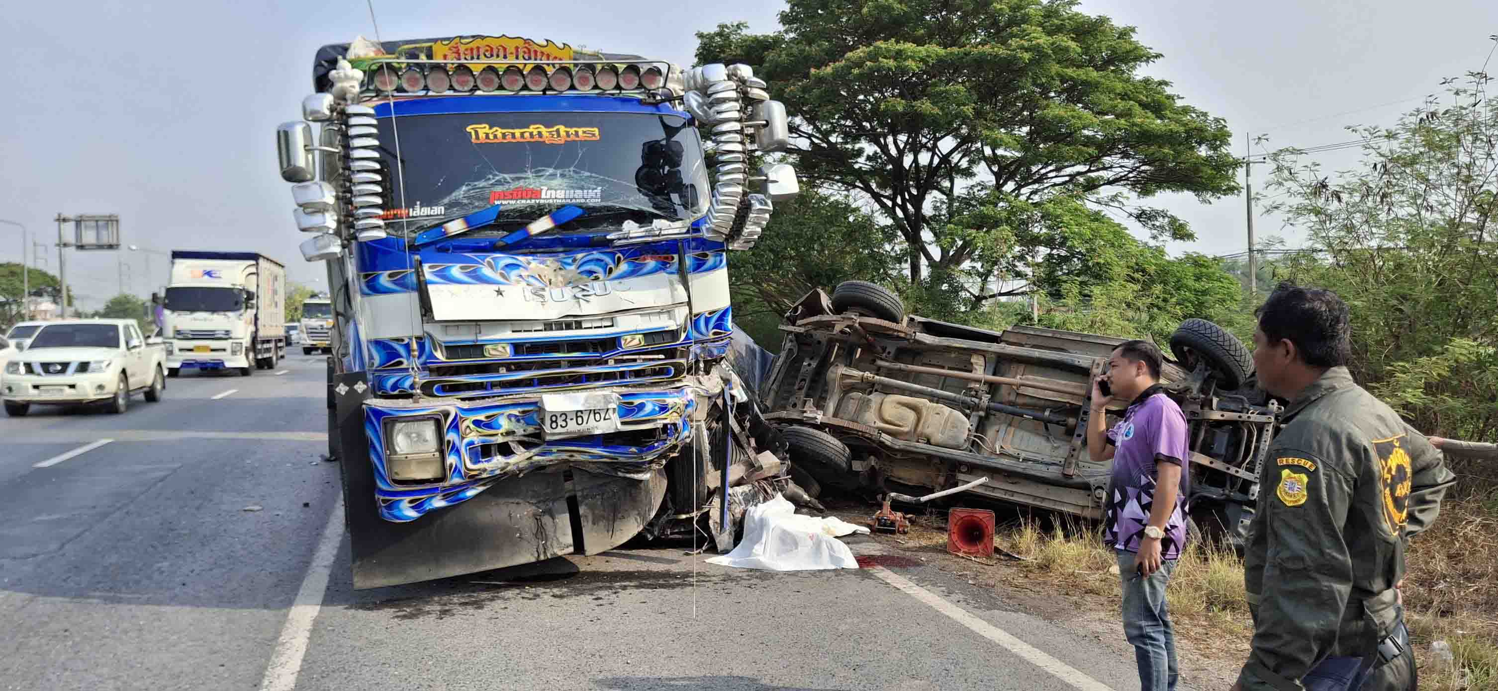 ชนยักษ์รถสิบล้อขนอาหารสัตว์เบี่ยงรถ ปาดหน้ารถทัวร์รับส่งพนง.เจ็บ8ราย