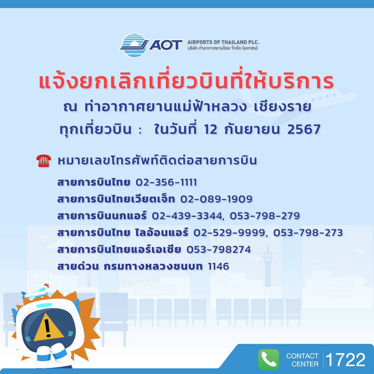 เชียงราย-ดร.กีรติ กิจมานะวัฒน์ กรรมการผู้อำนวยการใหญ่ บริษัท ท่าอากาศยานไทย จำกัด (มหาชน) (AOT) กล่าวว่า วันนี้ (12 กันย...