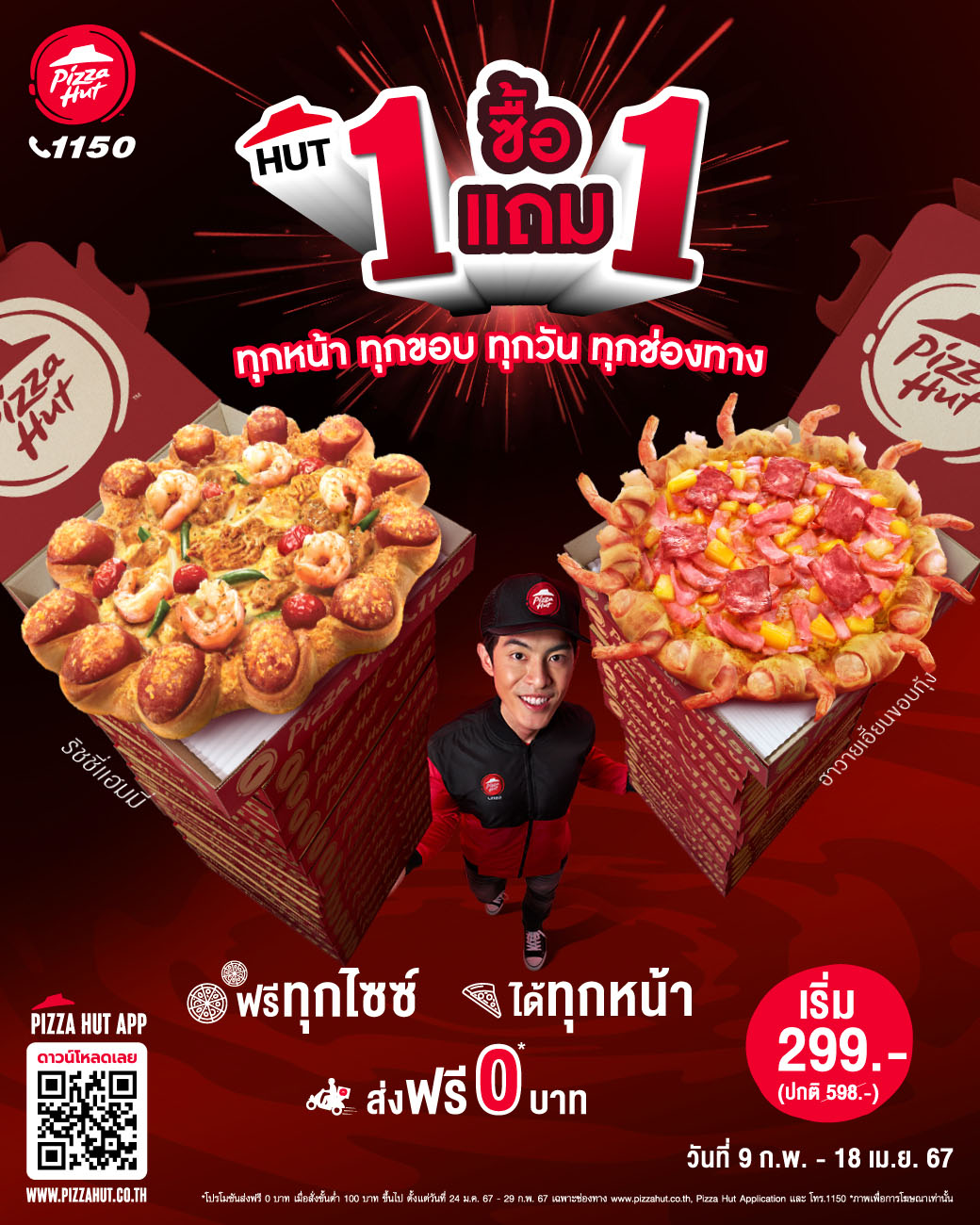 พิซซ่าฮัทจัดโปรHutซื้อ1แถม1อร่อยกัน ให้จุใจแถมส่งฟรี0บาท