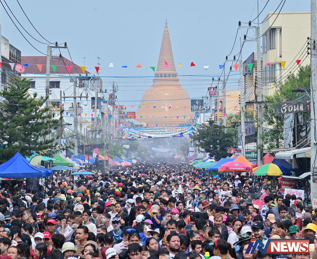 นักท่องเที่ยวเรือนหมื่นเล่นน้ำถนนต้นสน ไฮไลส่งท้ายสงกรานต์นครปฐมสุดคักคัก