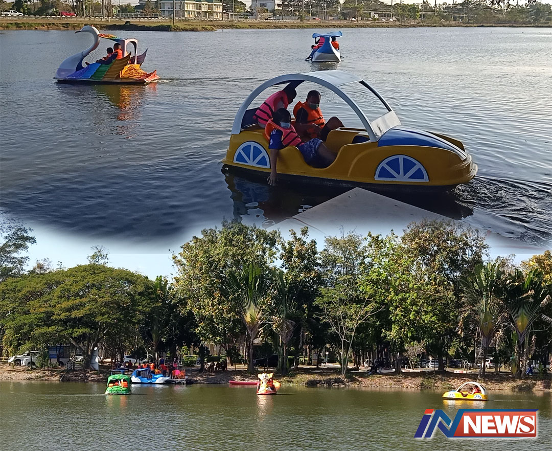 ศรีสะเกษ-วันปีใหม่ หลังทำบุญตักบาตรแล้ว พ่อแม่พาบุตรหลานเที่ยวเล่นพักผ่อนสวนสาธารณะปั่นจักรยานน้ำ