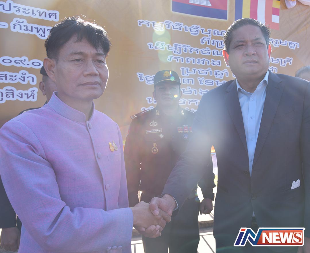 ศรีสะเกษ-ที่ด่านผ่านแดนถาวรช่องสะงำ ผู้ว่าฯศรีสะเกษจับมือผู้ว่าฯอุดรมีชัยเปิดกิจกรรมตักบาตรสองแผ่นดินไทย-กัมพูชาปี 2023