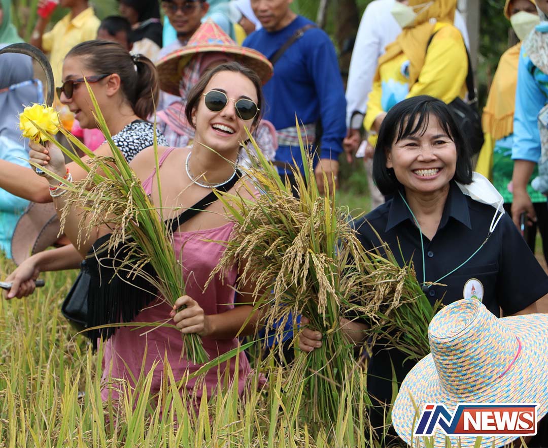 นักท่องเที่ยวต่างชาติร่วมลงแขกเกี่ยวข้าวตำข้าวในนาผืนสุดท้าย