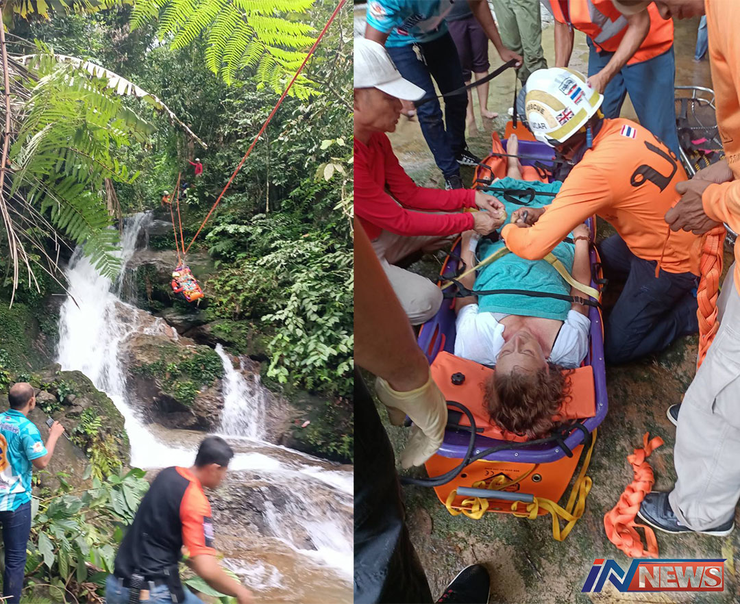พังงา-ด่วน...ช่วยนักท่องเที่ยวลื่นล้มบาดเจ็บบนน้ำตกทุ่งขมิ้นลงมาได้แล้ว ใส่เปลโรยลงมาด้วยเชือกทีละชั้น