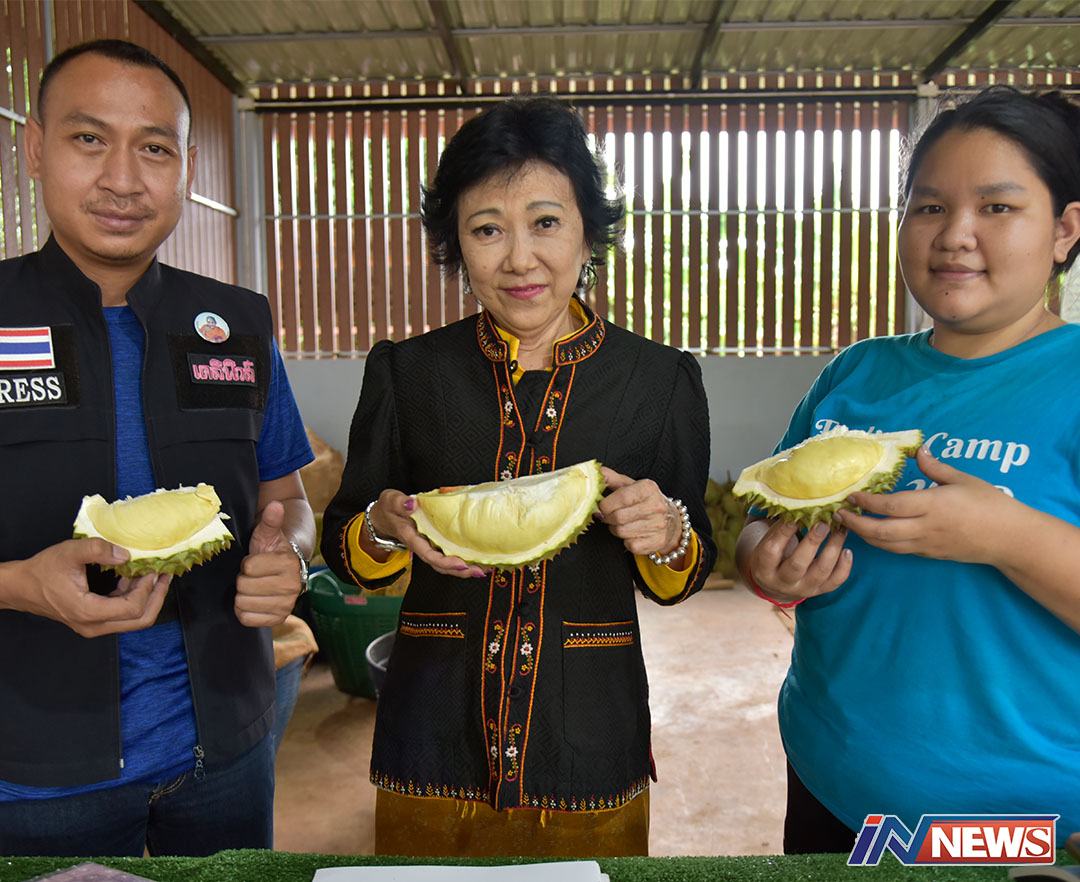 ศรีสะเกษ-ดร.กัลยาณี นายกฯท่องเที่ยวศรีสะเกษนำสื่อมวลชนจังหวัดศรีสะเกษลุยสวนทุเรียนภูเขาไฟสำรวจผลผลิตและราคาตลาด