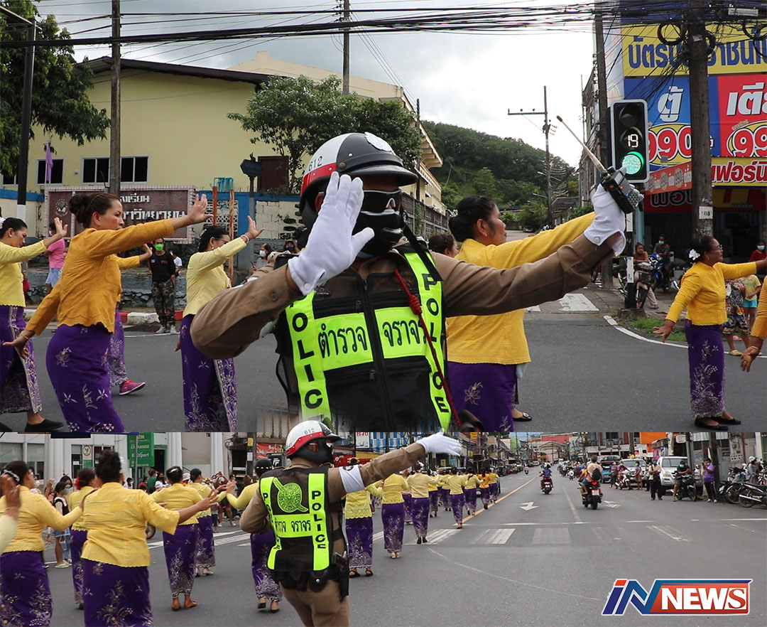 พังงา-น่ารัก...รองสารวัตรจราจรทนฟังเสียงเพลงไม่ไหวโชว์ลีลารำกับขบวนแห่สมโภชศาลหลักเมืองพังงา