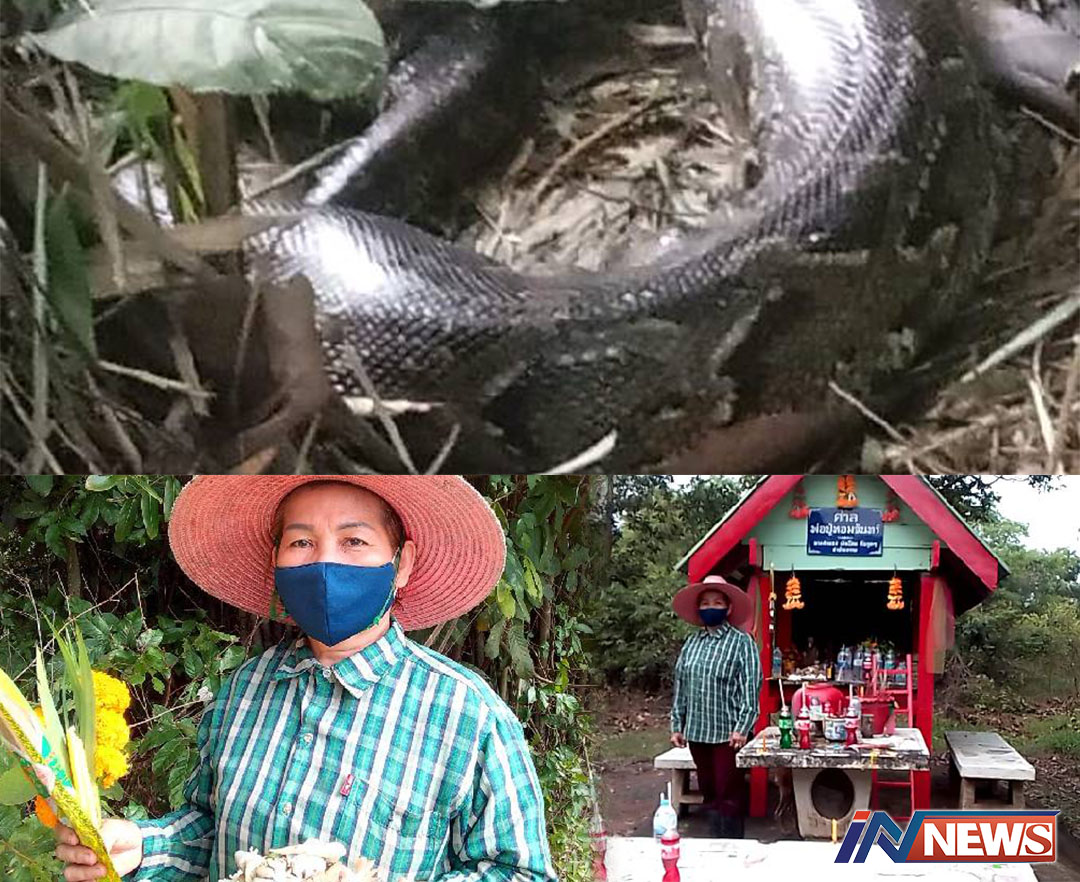 ฮือฮา!ภาพงูเหลือมยักษ์ขดอยุ่ข้างศาล คอหวยนำของเซ่นถวายเชื่ออิทธิฤทธิ์
