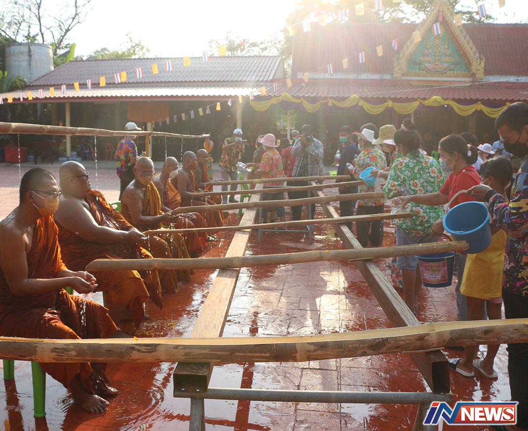 สิงห์บุรี-วัดบางสำราญ จัดสรงน้ำพระยุคโควิด พระโยมไม่สัมผัสใกล้กันโดยใช้รางไม้ไผ่เป็นธารน้ำสรงพระ ส่วนศาลา “ไอ...