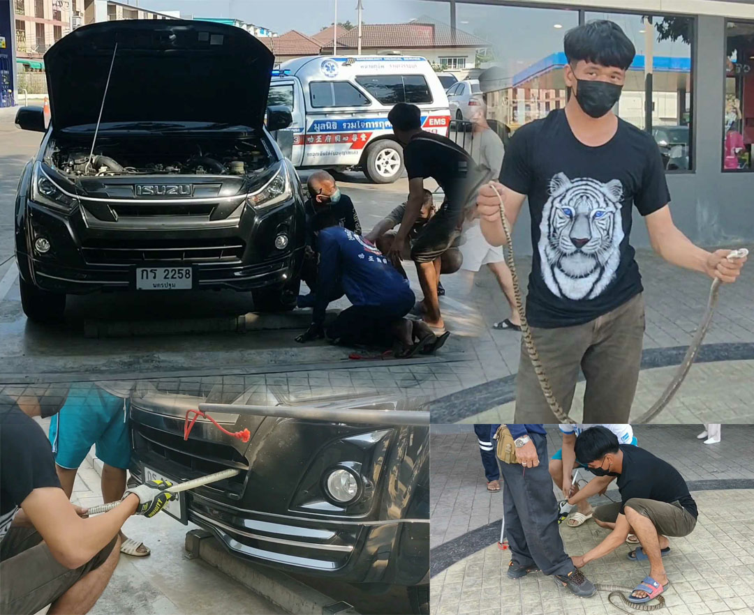 งูสิงใหญ่เลื้อยเข้ากระโปรงรถแจ้งจนท.จับ ชาวบ้านแห่จดทะเบียนรถเสี่ยงโชค