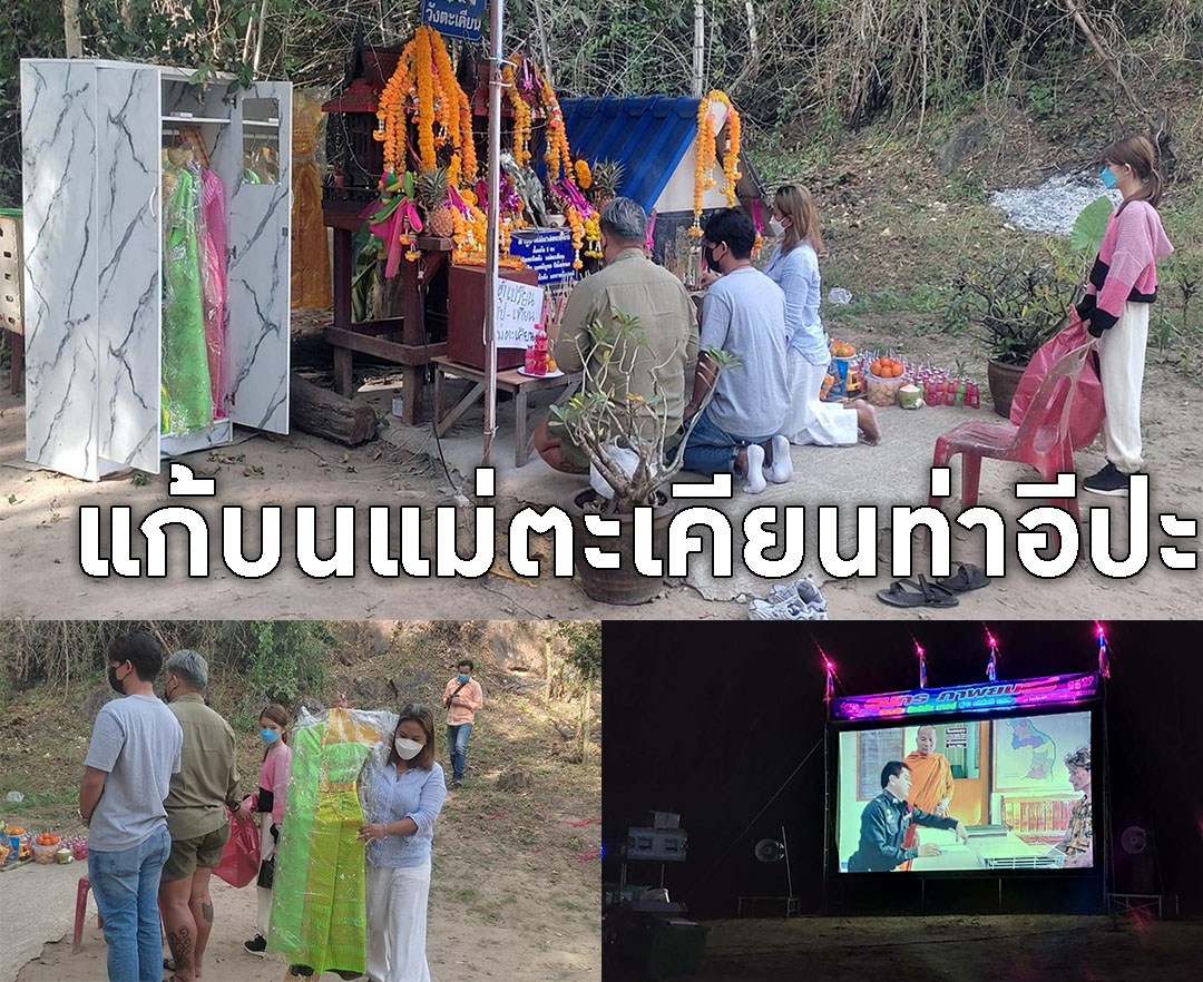 ราชบุรี-เซียนหวยดวงดี แห่จ้างหนังกลางแปลง นำชุดไทยสไบลูกไม้หลากสี พร้อมน้ำแดง พวงมาลัย แก้บนเจ้าแม่วังตะเคียน แก่งท่าอีป...