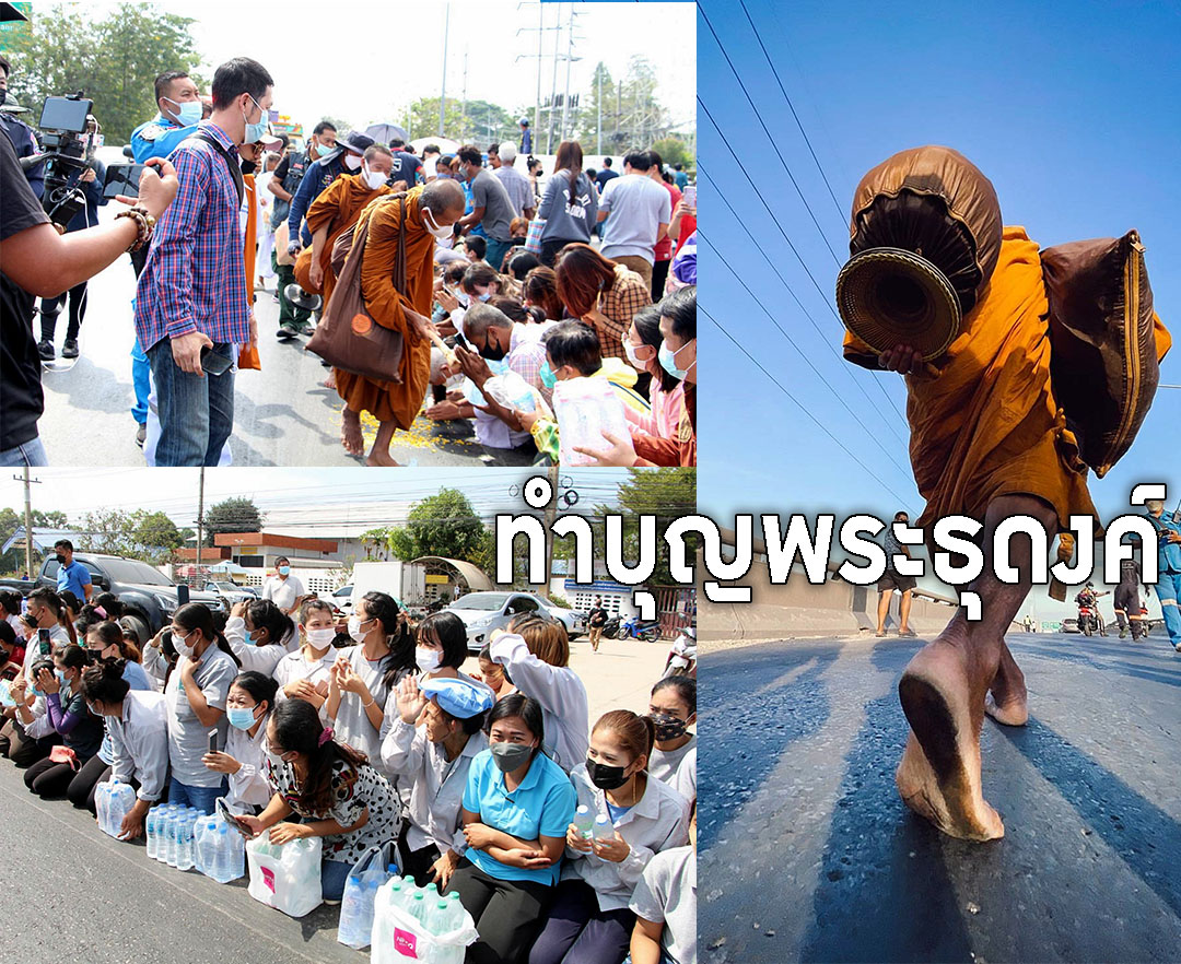 ชาวนครปฐมตั้งแถวรอถวายน้ำพระธุดงค์ กับหลวงตาบุญชื่นนั่งยาวเป็นกิโล