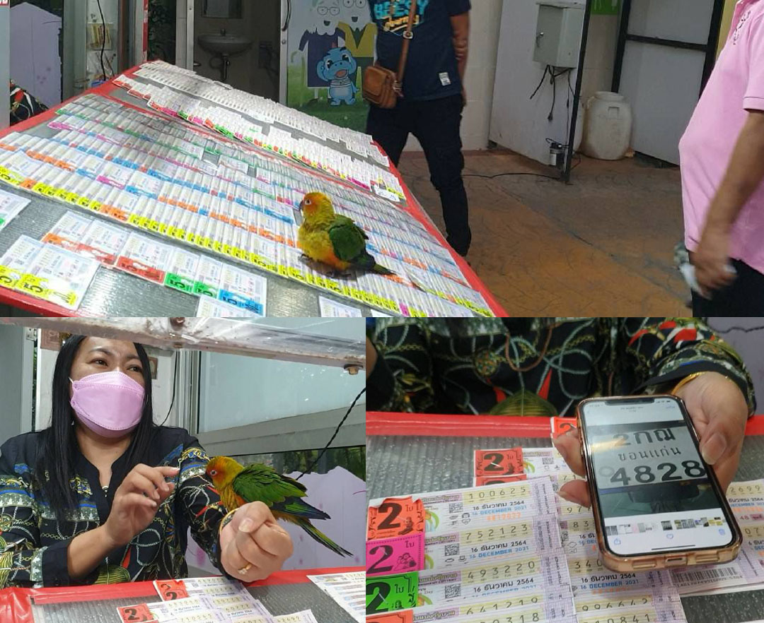 นกแก้วบินเกาะไหล่สาวใหญ่จิกเลขเด่น ในแผงสลากกินแบ่งงวดนี้ให้เลขเด็ด
