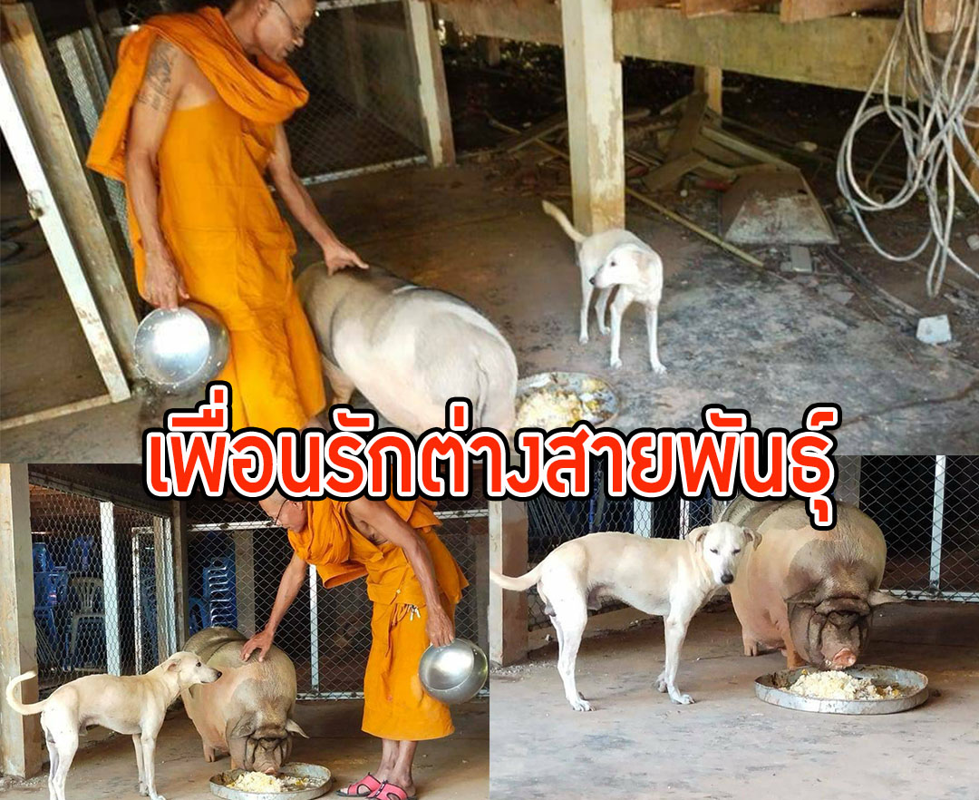 นครนายก - หมูแสนรู้เดินบิณฑบาตรกับหลวงพ่อกลับมาวัดกินข้าวก้นบาตรกับหมา แบบเพื่อนพี่น้องไม่เคยกัดกัน ฉลาดแสนรู...