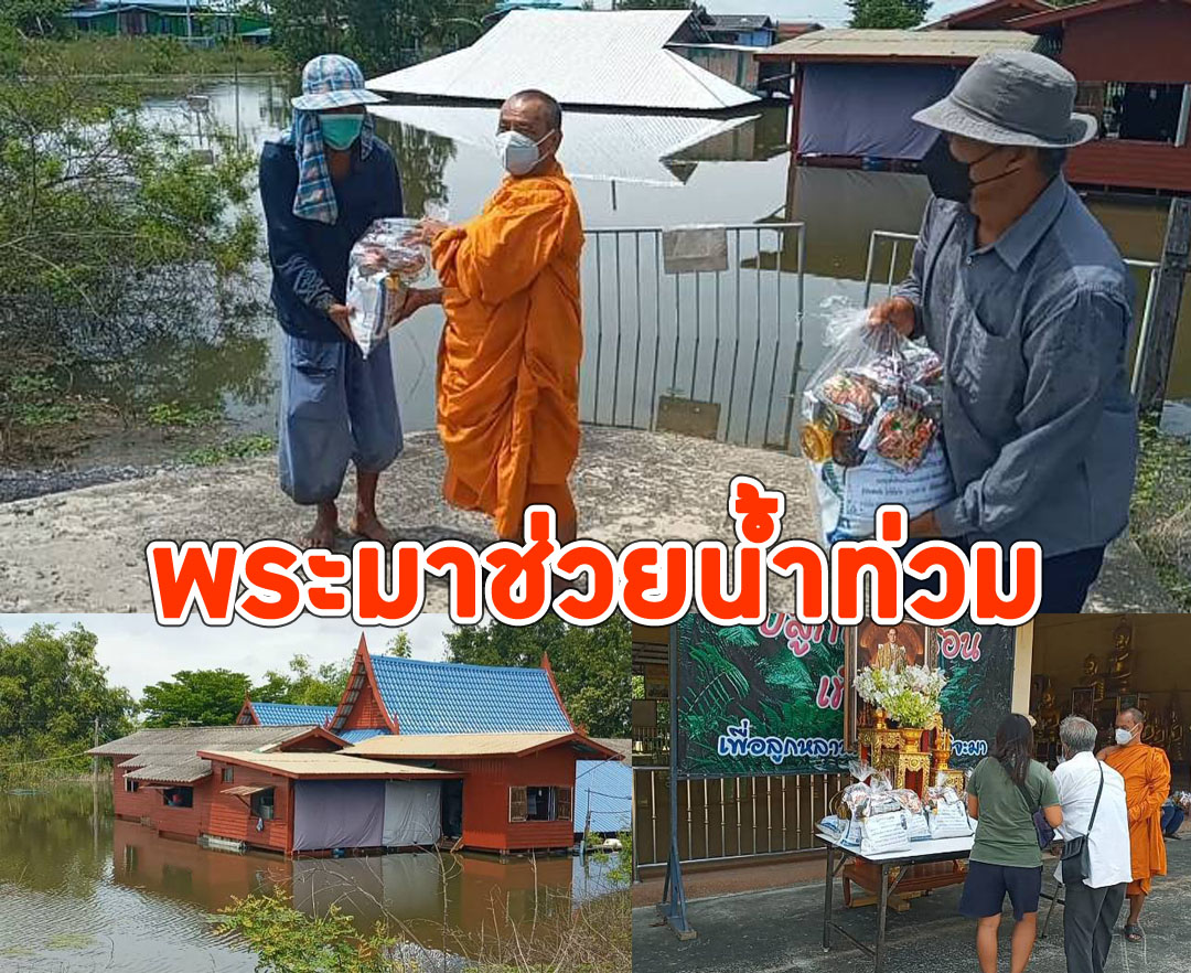 เจ้าอาวาสวัดบางเลนนำคณะสงฆ์ลุยน้ำช่วย ญาติโยมบ้านน้ำแทบมิดหลังคา