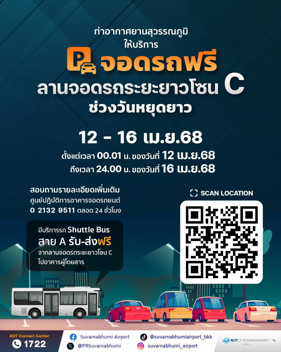 สมุทรปราการ-ท่าอากาศยานสุวรรณภูมิ (ทสภ.) เปิดให้บริการจอดรถฟรี ณ ลานจอดรถระยะยาวโซน C ระหว่างวันที่ 12 – 16 เมษายน...
