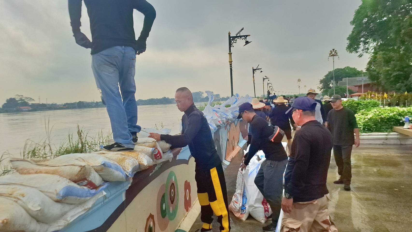 ชาวสิงห์บุรีร่วมใจกรอกทรายกั้นสันเขื่อน ป้องกันน้ำล้นเข้าเขตเมือง/อินทร์บุรีอ่วม