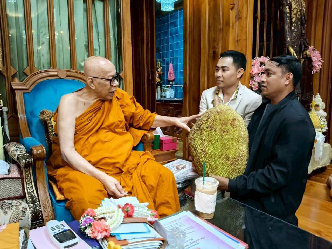 หลวงพ่อประทวนเกจิดังให้ศิษยานุศิษย์ เข้ากราบสักการะและถวายผลขนุน