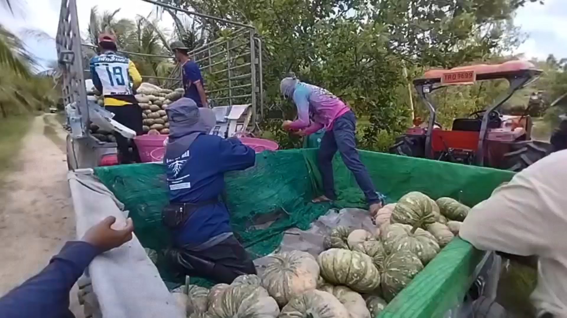 สงขลา-เกษตรกรเมืองสงขลา ใช้รถแทรกเตอร์ 2 คัน ร่วมลงแขกเก็บเกี่ยวผลผลิตฟักทอง 10 ไร่ ครึ่งวัน ได้ผลผลิตกว่า 8 ตัน สร้างรา...