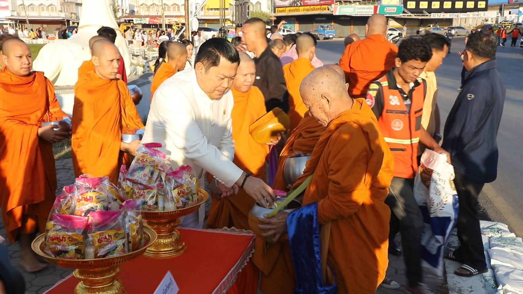 กาญจนบุรี-นอภ.ร่วมกับ นย.ทต.ท่าม่วง กาญจนบุรี และชาวตลาดนางลอย สืบสานประเพณีไทย ตักบาตรข้าวสารอาหารแห้งพระภิกษุสงฆ์เนื่อ...