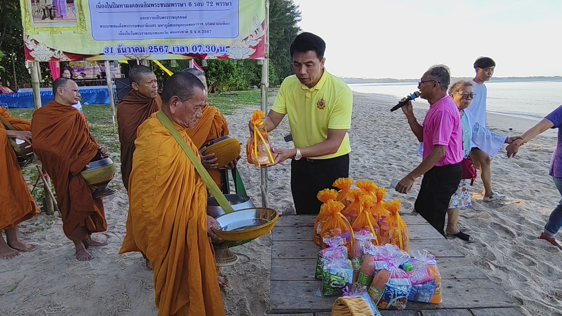 พังงา – นายอำเภอตะกั่วป่าร่วมชาวบ้านร่วมใจทำบุญตักบาตรริมชายทะเลหาดบางสัก ส่งท้ายปีเก่าต้อนรับปีใหม่