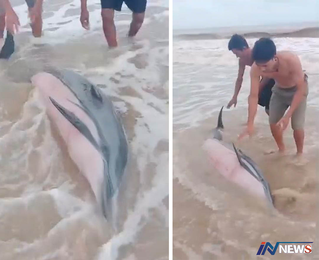 สุดดีใจช่วยเหลือโลมาสีชมพูขึ้นมาเกยตื้น ชายหาดเกาะคอเขากับลงสู่ทะเลแล้ว