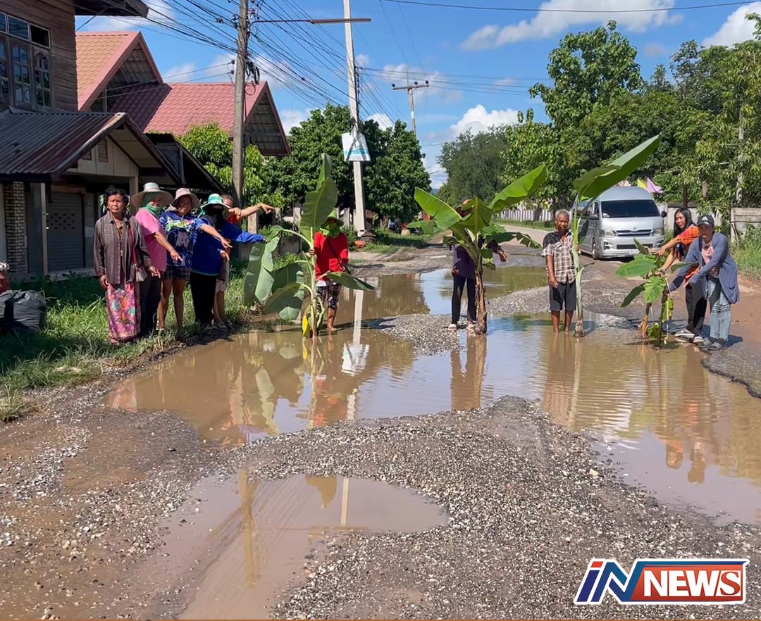 หนองบัวลำภู-ทุกข์ชาวบ้านร้องถนนพังเป็นหลุมลึกนำต้นกล้วยมาปลูกกลางถนนเพื่อเป็นสัญญาณว่าหลุมลึกกลัวรถจะเกิดอุบัติเหตุ
