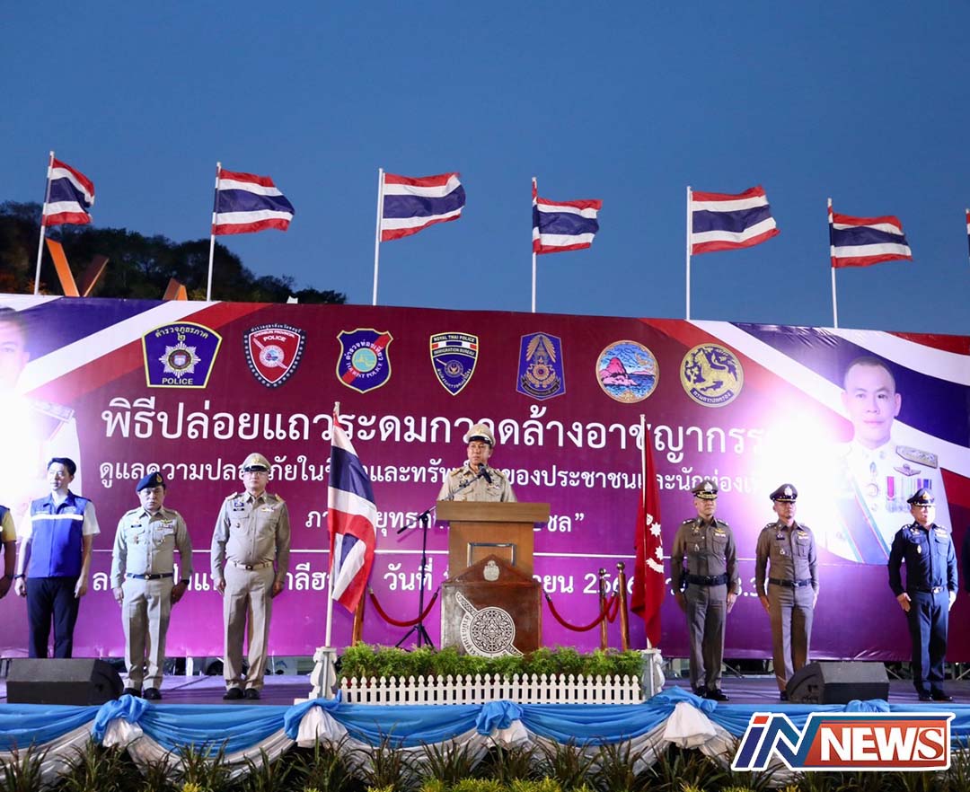ชลบุรี-ผู้ว่าฯชลบุรีเปิดพิธีปล่อยแถวระดมกวาดล้างอาชญากรรม เพื่อดูแลรักษาความปลอดภัยในชีวิตและทรัพย์สินของประชาชนและนักท่...