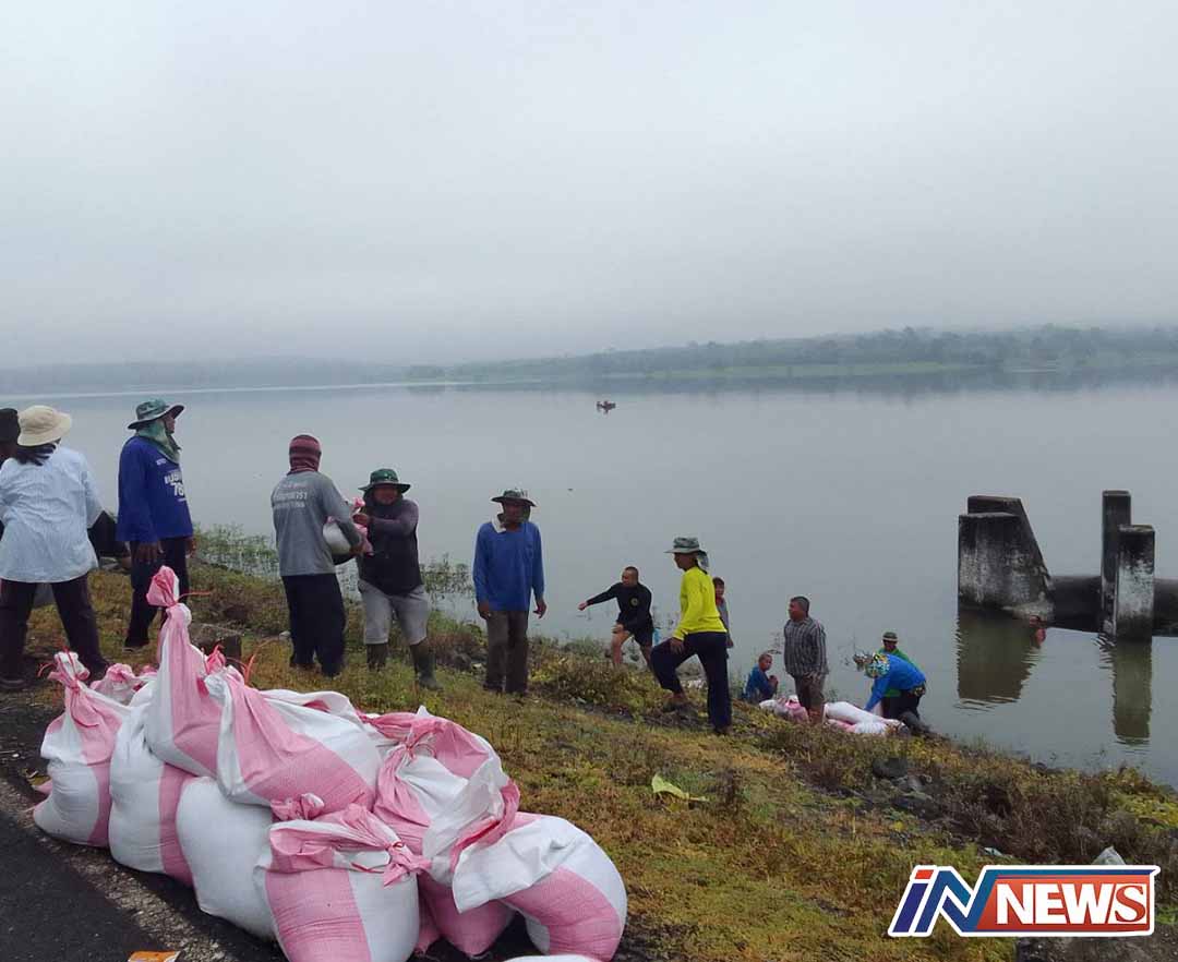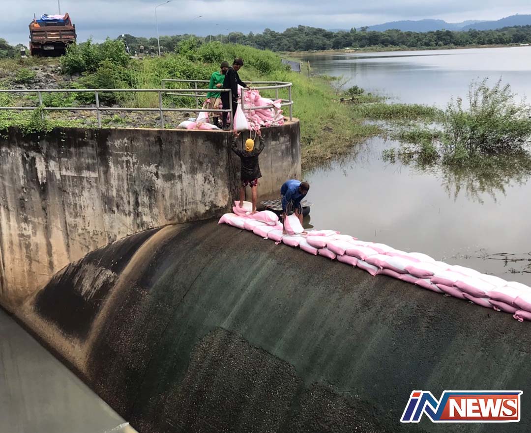 ศรีสะเกษ-ผอ.โครงการชลทานศรีสะเกษกรอกกระสอบทรายเสริมสันอ่างเก็บน้ำห้วยห้วยขนุน เพิ่มระดับน้ำเพื่อการเกษตรในช่วงฤดูแ...