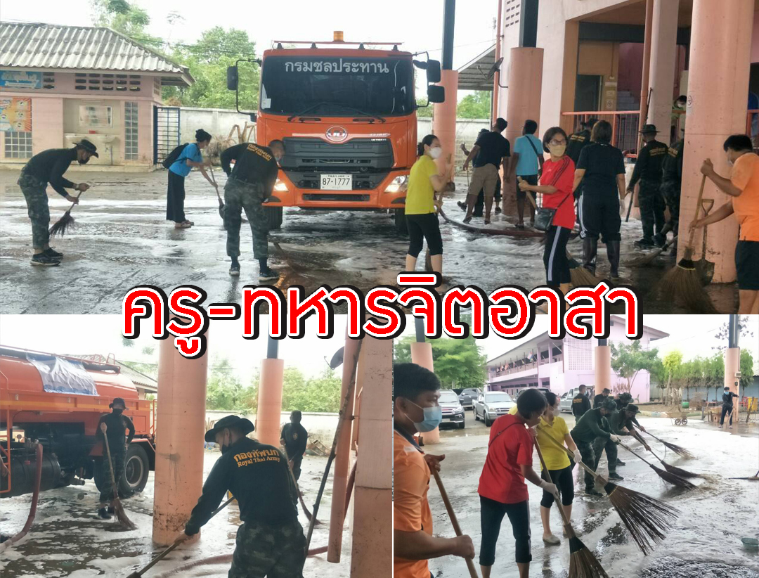 คณะครู-ทหารมทบ.18ร่วมล้างโรงเรียน หลังน้ำลดจากภาวะน้ำท่วม