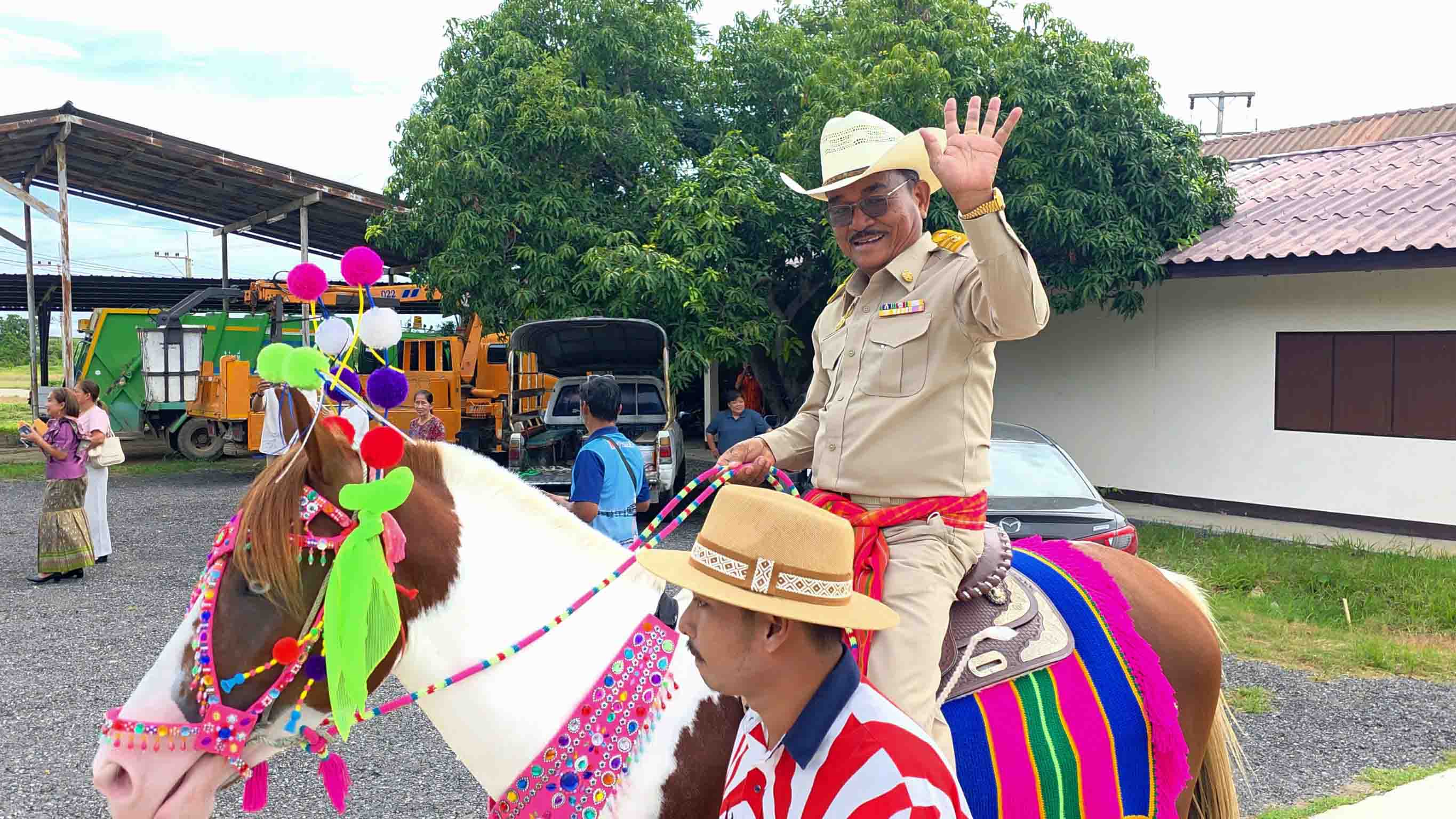 นายกเล็กทต.หนองหญ้าดอกขาวขี่ม้าคู่ใจ เข้าทำงานครั้งแรกเพื่อเปิดประชุมสภาฯ