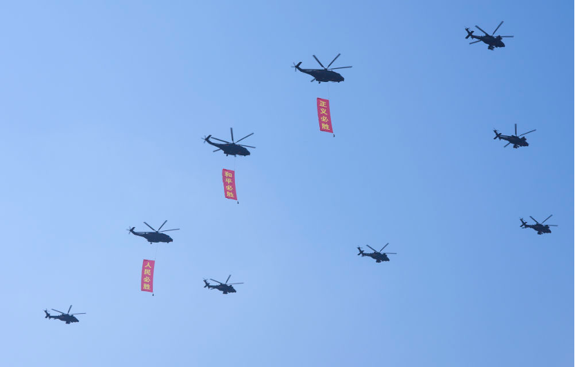 ฝูงเครื่องบินคุ้มกันนำธงชาติจีนบินเหนือจัตุรัสเทียนอันเหมิน