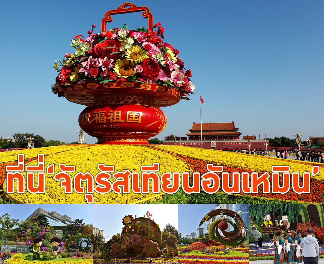 จีน-ตกแต่งจัตุรัสเทียนอันเหมินอย่างสวยงาม ด้วยกระเช้าดอกไม้ขนาดยักษ์และจัดส่วนขนาดย่อมเป็นธีมต่างๆสื่อถึงการพัฒนาของจีน ...