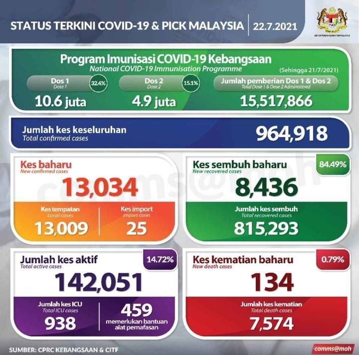 มาเลเซียวันนี้มีผู้ติดโควิดเพิ่มขึ้นต่อเนื่อง วันนี้ 13,034 ราย ขณะที่ผู้เสียชีวิต 134 ราย ส่วนการเข้ารับวัคซีนล่าสุดที่...