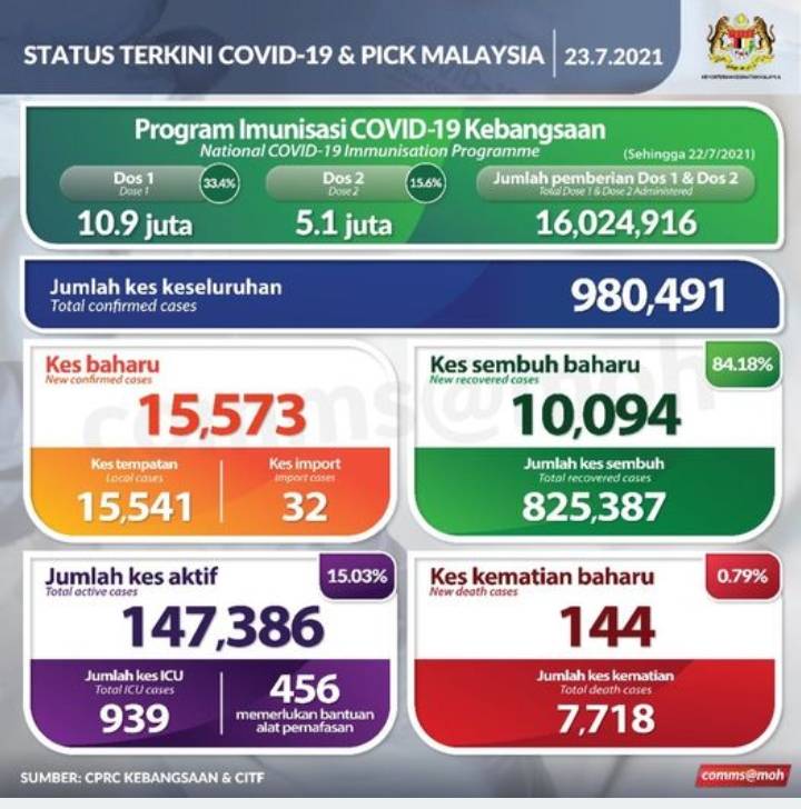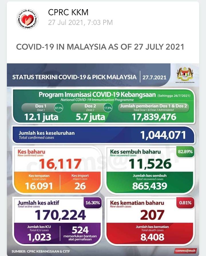 มาเลเซีย-สถานการณ์ผู้ป่วยโควิดประจำวันที่27 กรกฏาคม2564 ผู้ป่วยใหม่เพิ่มขึ้น 16,117 ราย ส่วนผู้เสียชีวิตทรงตัวในระดับสูง...